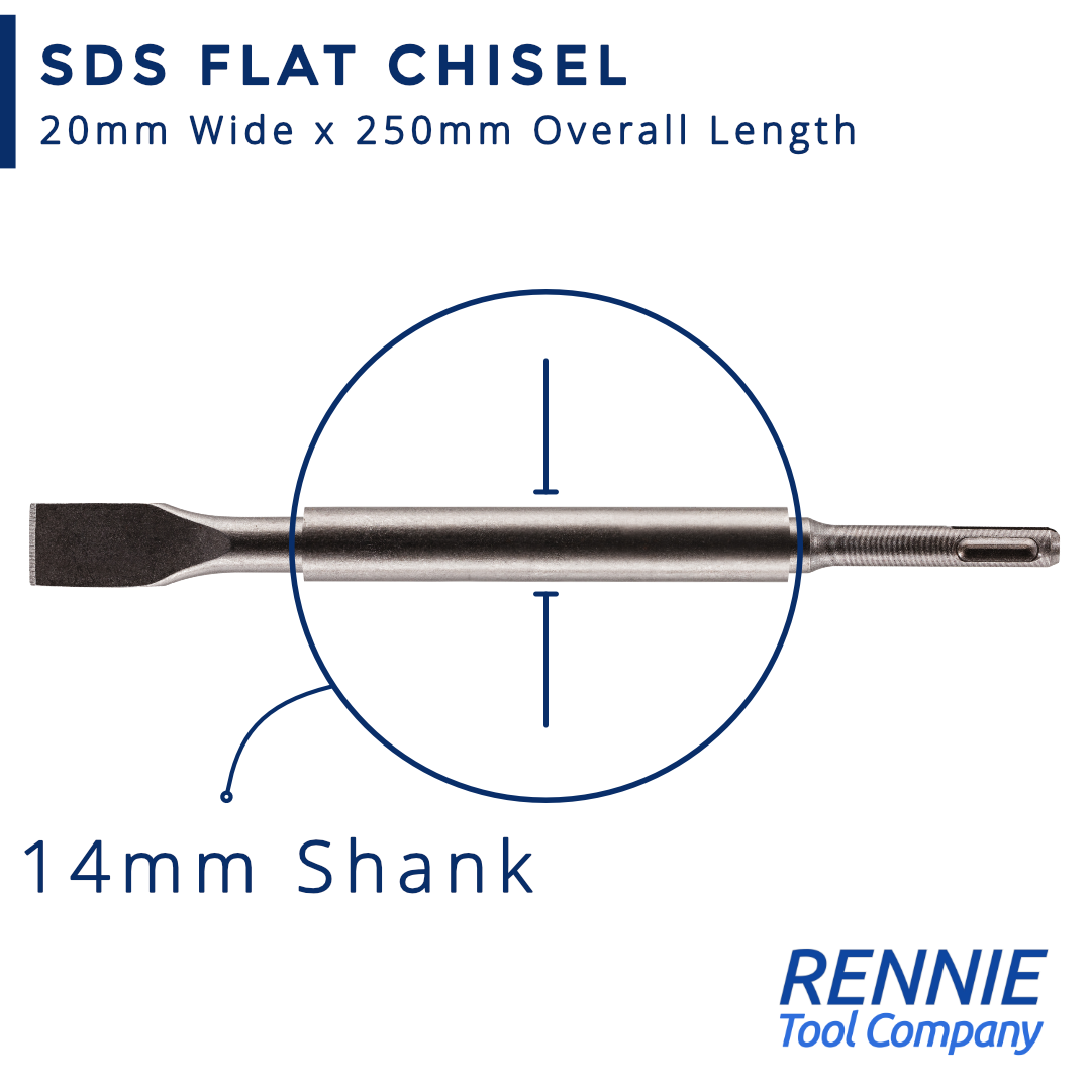 - Manufactured from high quality tempered steel. This SDS flat chisel drill bit is made from hardened alloy steel. Dimensions - 20mm wide at the tip x 250mm overall length. It also has a 14mm shank which provides increased strength.
