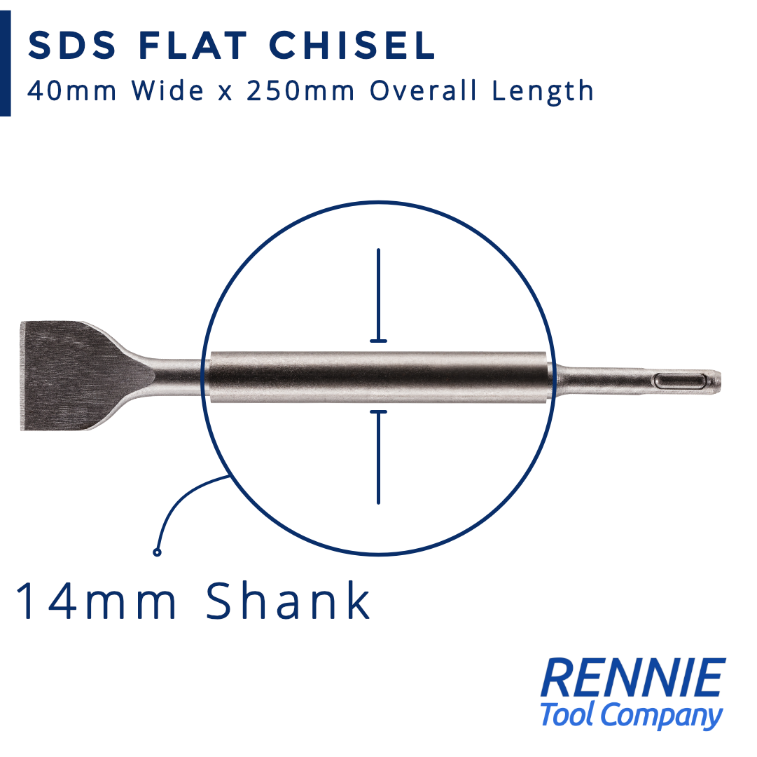 - Manufactured from high quality tempered steel. This SDS flat chisel drill bit is made from hardened alloy steel. Dimensions - 40mm wide at the tip x 250mm overall length. It also has a 14mm shank which provides increased strength.