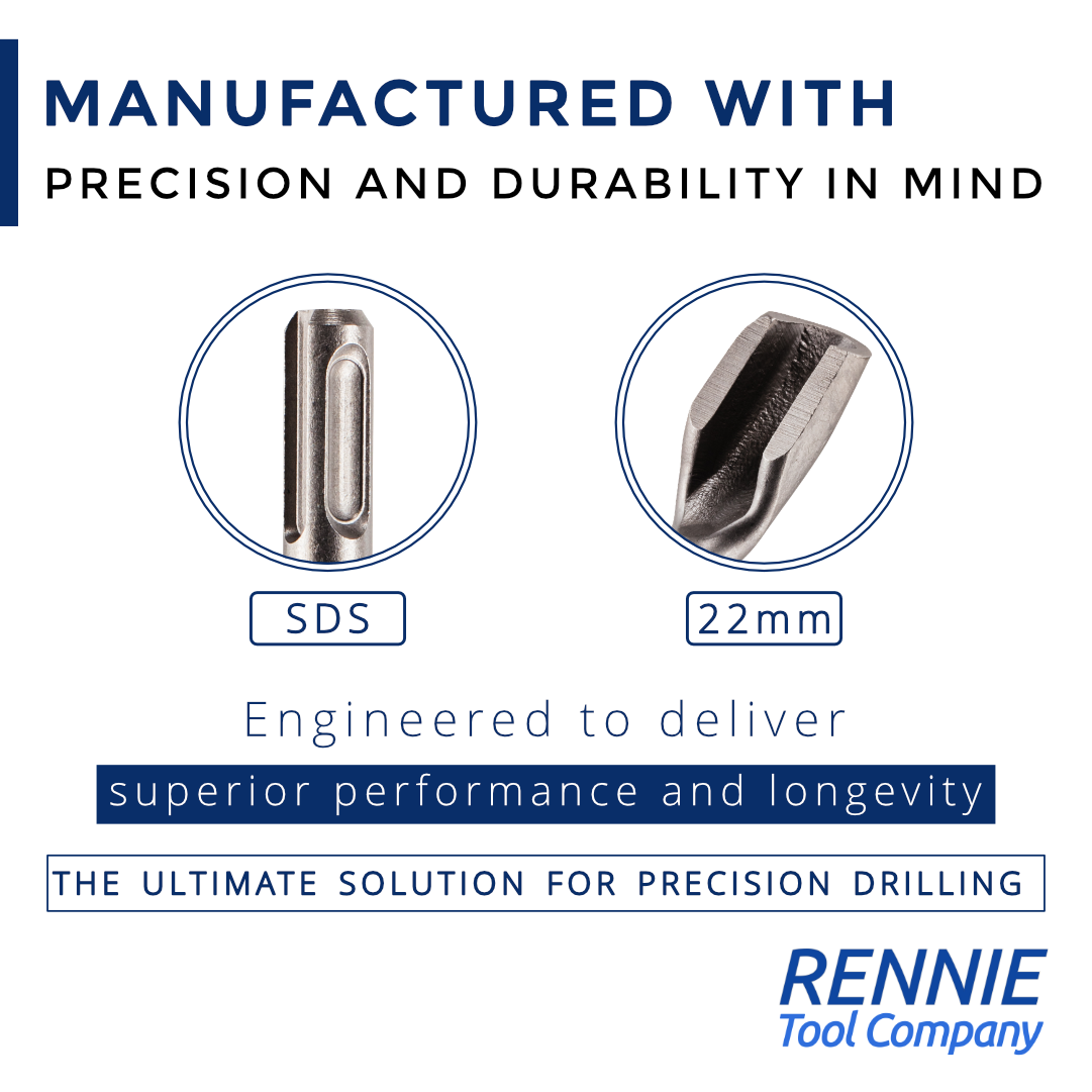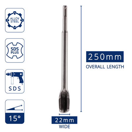 - Dimensions - 22mm wide at the tip which allows for channels 22mm wide to be formed. 250mm overall length. Compatibility - This SDS chisel drill bit is compatible with all the leading brands of sds drills, they are compatible with Bosch, Dewalt, Milwaukee, Einhell, Erbauer, Ryobi, Metabo, Makita SDS drills etc
