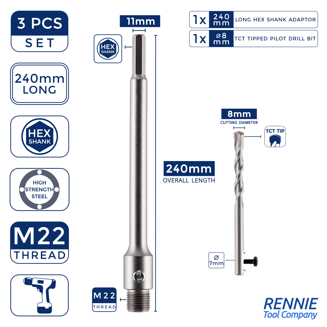Each TCT core drill bit comes with a 240mm long Hex shank adapter and TCT tipped centre drill.